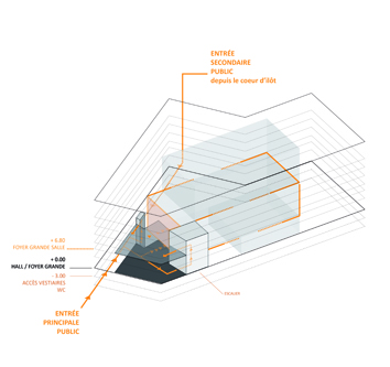 définition ANALYSE DES ENJEUX DE LA PROBLEMATIQUE DU SITE/ Au cĹ“ur d'un quartier en profond renouvellement, l’îlot A de Châtelaine est un carrefour situĂ© Ă la pointe d'un quartier urbanistiquement dĂ©structurĂ© et divisĂ© par les infrastructures de transport. Le site ne possède pas d'identitĂ© propre et ne constitue un lieu identifiable dans la ville que par ses contraintes de circulations. Sur une surface peu Ă©tendue, le site regroupe Ă la fois des quartiers de logements en renouvellement, des habitations existantes Ă l'Ă©chelle plus modeste et des axes de circulations importants qui impactent fortement le paysage (train, viaduc automobile, avenue, …). Avec la crĂ©ation du pĂ´le d'Ă©change de transport multimodal et le prolongement de la voie verte, une opportunitĂ© s'offre au quartier de refonder durablement les modes de dĂ©placements sur le site Ă l'Ă©chelle locale. Le projet se doit d'intĂ©grer ces nouvelles donnĂ©es et de les mettre en exergue afin de recrĂ©er un Ă©quilibre entre l'usage des mobilitĂ©s douces et des mobilitĂ©s plus dures. Le projet a pour objectif de transformer cet ilot en centralitĂ© pour le quartier de Châtelaine et de lui donner un rayonnement plus fort grâce Ă la prĂ©sence du centre culturel. Le travail du plan masse vise Ă recrĂ©er une structure urbaine logique et lisible. L'lot A devient alors un pivot entre toutes les ambiances urbaines existantes et futures dans la ville. Les implantations du centre culturel et de la rĂ©sidence Ă©tudiante du projet permettent Ă la fois de restructurer ce tissu urbain Ă l'Ă©chelle du quartier mais aussi de rĂ©pondre aux contraintes du site Ă l'Ă©chelle de la parcelle (reprĂ©sentativitĂ© et images, risques OPAM, gestion du bruit, flux, ...). Le projet place le piĂ©ton et l'habitant au centre de la rĂ©flexion. Concept urbain et implantation des bâtiments Chaque façade urbaine possède son propre caractère. L'implantation et l'expression des bâtiments rĂ©pondent Ă leur contexte. NORD - PLATEFOME D'ECHANGE MULTIMODALE/ Au nord, le carrefour de l'Ă©cu est le futur cĹ“ur de quartier avec la crĂ©ation de la plateforme d'Ă©change de transport multimodale. C'est sur cette façade que nous avons choisi de positionner le parvis d'entrĂ©e du centre culturel et son entrĂ©e principale. Espace le plus urbain du site, il deviendra la vitrine du quartier de Châtelaine et un signal fort dans la ville. Afin de se prĂ©server au maximum des nuisances du site environnant, le centre culturel et son parvis ont Ă©tĂ© placĂ© Ă 2m en contre bas de la future plateforme d'Ă©change de transports multimodale. Cette sĂ©quence d'entrĂ©e permet Ă la fois une mise en scène de l'accès au centre culturel, une appropriation diffĂ©rente du parvis par rapport Ă la place haute, et un rĂ©glage plus aisĂ© des niveaux de sol du site. SUD - QUARTIER RESIDENTIEL/ Au sud, la limite de la parcelle est quant Ă elle en continuitĂ© avec le quartier de logements en renouvellement du secteur L. La rĂ©sidence Ă©tudiante est donc positionnĂ©e sur cette limite afin de faire la transition entre le quartier rĂ©sidentiel au sud et le centre culturel au nord. De plus, cette implantation permet de dĂ©velopper les façades du bâtiment hors des alignements des vois CFF et de l'avenue de l'AIN, pour le protĂ©ger des Ă©ventuelles nuisances. EST ET OUEST - AXES DE CIRCULATION FORTS/ Sur les façades est et ouest, les voies CFF, l'avenue de l'Ain et le viaduc de l'Ecu sont des axes de circulations importants et potentiellement dangereux. A l'ouest, l'avenue de l'Ain et le viaduc de l'Ecu forment une barrière physique et visuelle dans le paysage et constituent une source de bruit et de danger pour les usagers. Elle est la façade de la vitesse et des accès motorisĂ©s sur le site. Les bâtiments du centre culturel et des logements sont donc plus fermĂ©s Ă l'ouest et se protègent davantage des nuisances engendrĂ©es. Les accès depuis ces axes sont rĂ©duits au minimum (livraisons, entres des artistes du centre culturel). A l'est en revanche, la voie ferrĂ© situĂ©e en contre bas est plus discrète et constitue un Ă©lĂ©ment de paysage urbain qui s'accorde bien avec le programme du centre culturel. La vue y est dĂ©gagĂ©e. Bien que le projet intègre des protections exigĂ©es par la rĂ©glementation OPAM, les programmes publics du centre culturel peuvent se dĂ©velopper sur cette façade pour profiter de la vue. AccolĂ© au CCC et faisant face Ă la rĂ©sidence Ă©tudiante, l'hĂ´tel se dĂ©veloppe Ă proximitĂ© de l'avenue de l'Ain et tire tous les avantages de cette situation : facilitĂ© d'accès et visibilitĂ©, proximitĂ© directe avec le CCC, accès privatisĂ© et remarquable. I fait la transition entre la rĂ©sidence et le centre culturel. COMPACITE ET ESPACES URBAINS/ Les programmes de ce projet sont source Ă valoriser et animer les espaces publics de la ville de Vernier. Au-delĂ des simples usagers, les espaces publics crĂ©er sur cette parcelle sont un apport pour toute la communautĂ© et profite Ă chacun. Le projet se veut donc le plus compact possible pour libĂ©rer un maximum d'espace au sol, crĂ©er des espaces extĂ©rieurs aux ambiances variĂ©es et laisser la porositĂ© des sols Ă sont maximum. Le concept d'implantation vise Ă crĂ©er un cĹ“ur d'ilot public protĂ©gĂ© qui s'organise entre le centre culturel et les logements Ă©tudiants. C'est aussi dans ce cĹ“ur que passe la voie verte pour renforcer l'animation et l'attractivitĂ© de ce lieu. CONCEPT PAYSAGER ET APPROPRIATION DES ESPACES EXTERIEURS/ Le traitement paysagĂ© de la parcelle s'adapte en fonction des besoins de chaque espace du site. La compacitĂ© des constructions permet de libĂ©rer les sols. Une grande partie de la parcelle est recouverte d'un matĂ©riau semi poreux. Le parvis d'entrĂ©e du centre c