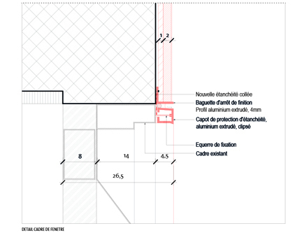 définition Il s'agit d'un projet d'assainissement de façade pour un bâtiment accueillant un Data Center situé 6 rue Richard Wagner à Genève. La Commission d'Architecture porte une attention particulière à cet édifice - non classé - mais jugé digne d'intérêt pour sa façade en briques apparentes et pour l’aspect singulier de ses fenêtres. Depuis sa construction en 1985, ledit bâtiment a connu de nombreux problèmes d'infiltrations d'eau en façade, au niveau des fenêtres. Nous avons donc été mandatés, avec le bureau d'ingénieur façade Concept F, pour dresser un nouveau diagnostic du problème et proposer plusieurs variantes de rénovation permettant de le résoudre durablement. C'est la variante économique, permettant de maîtriser l'infiltration en toiture et en façade, qui a été sélectionnée par le maître d’ouvrage. Le travail consiste à crépir la totalité de la façade, à reprendre la tôlerie de finition autour des cadres de fenêtre et à renforcer l'étanchéité de la toiture. Pour rappeler cet aspect travaillé de la brique, nous avons choisi un crépis gris structuré à gros grains afin d'amener du relief et créer un nouveau dialogue entre la façade et la lumière naturelle. La Commission d'Architecture a également émis la volonté de distinguer les têtes de dalle en béton du reste de la façade. Ainsi, nous avons choisi de traiter ces éléments avec un crépis à grain lisse, délimité par de fines baguettes de finition en profilé aluminium. La tôlerie de finition autour des cadres de fenêtre est délibérément clair pour contraster avec le nouveau crépis gris foncé et ainsi redessiner les fenêtres existantes. localisation Genève maître de l'ouvrage PSP coût 1'650'000.- chf date 2017-20 type de mandat direct projet [GAA] GUENIN Atelier d'Architectures collaborateur(s) M. Rajaofetra - L. Rahaingonjatovo - C. Commaille - O. Guenin association Estia - Concept F |